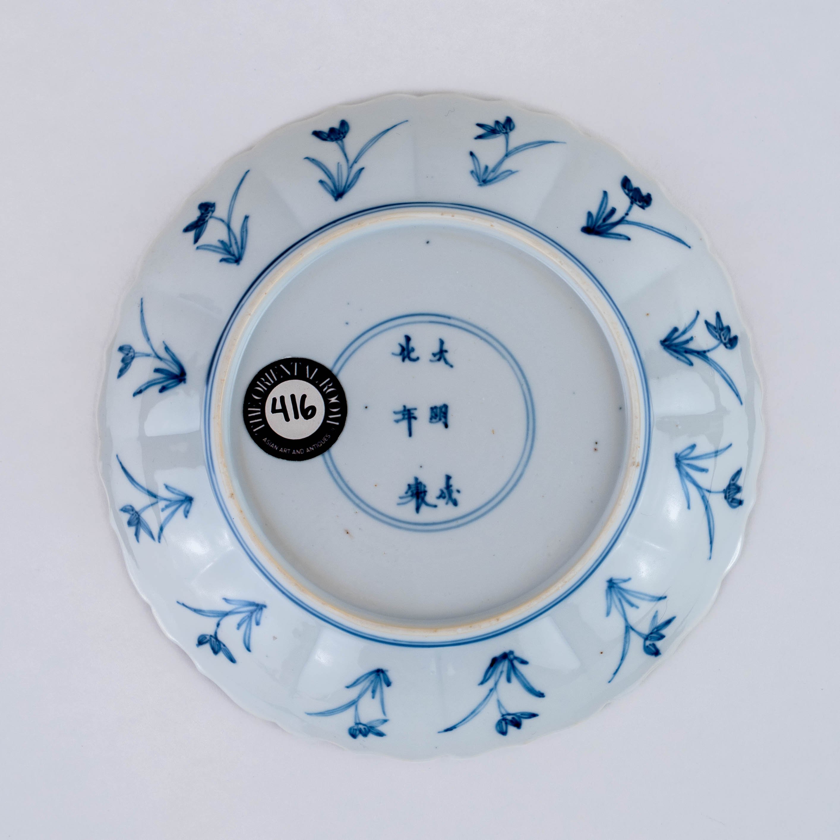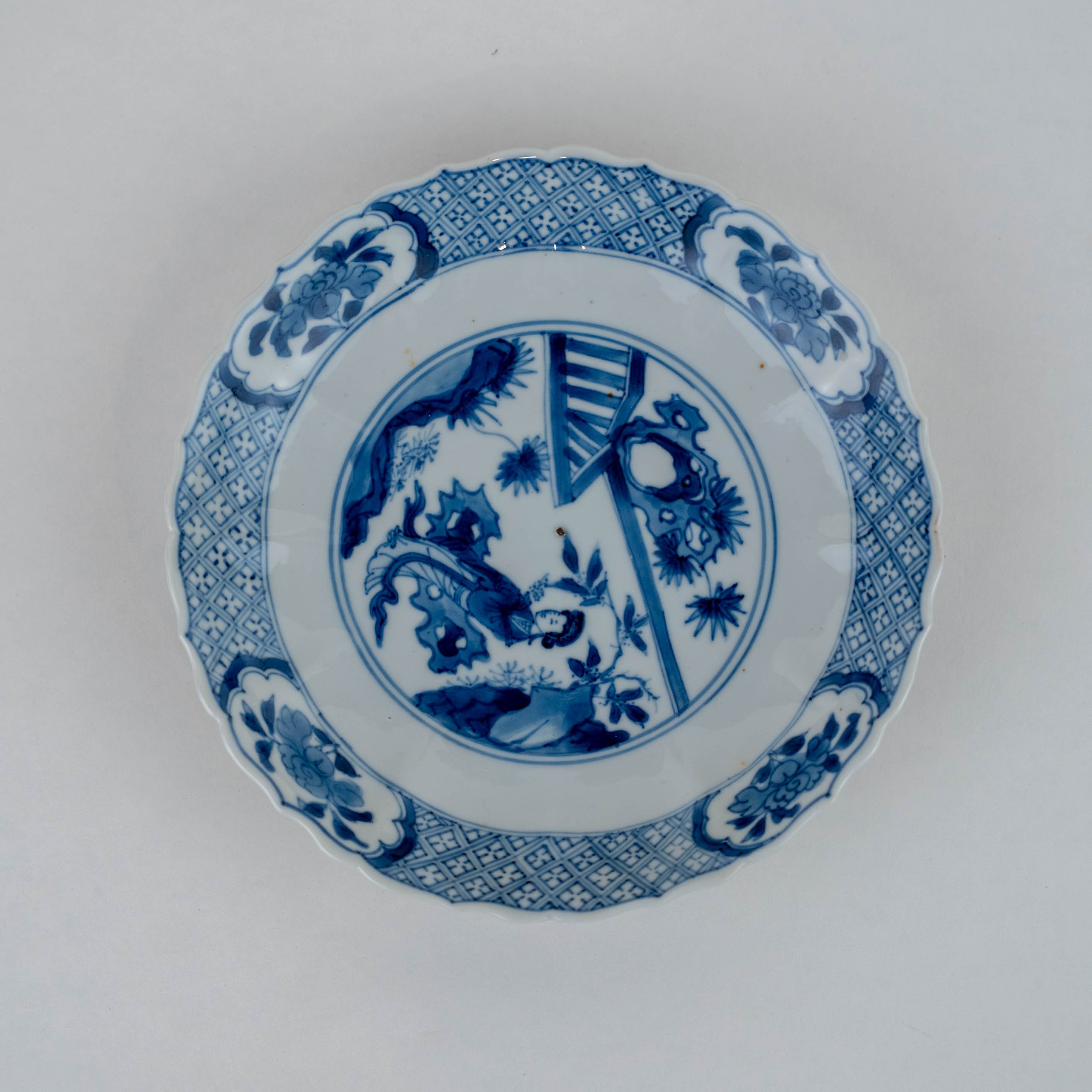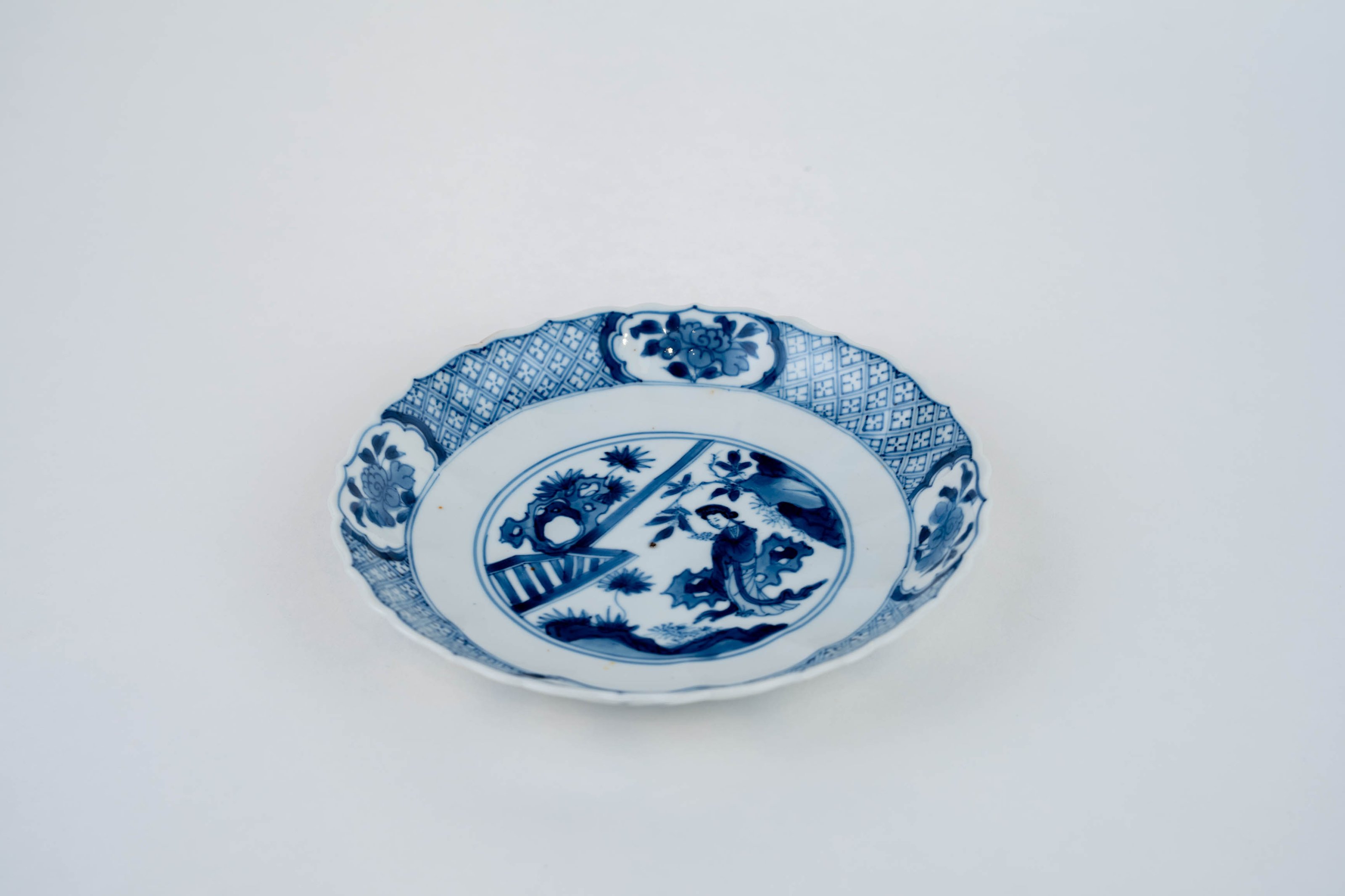 A blue and white barbed-rim plate decorated with a lady in a landscape, an apocryphal Chenghua mark to the base.
