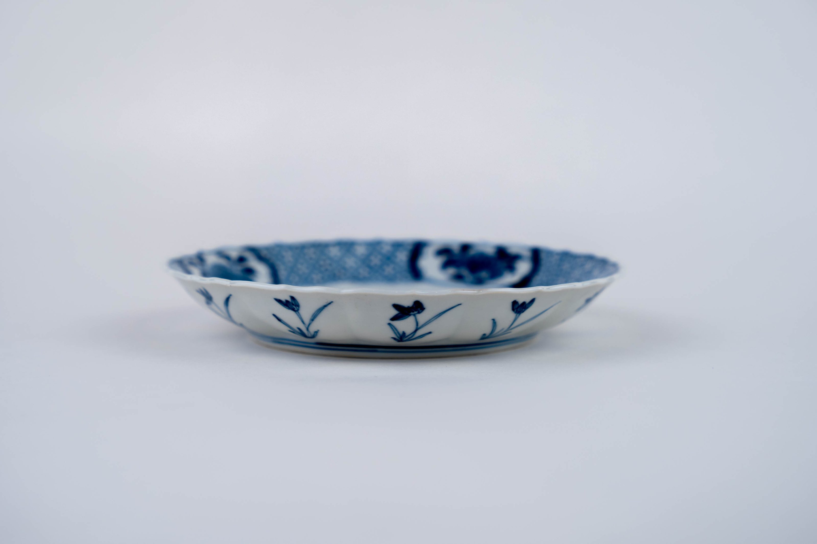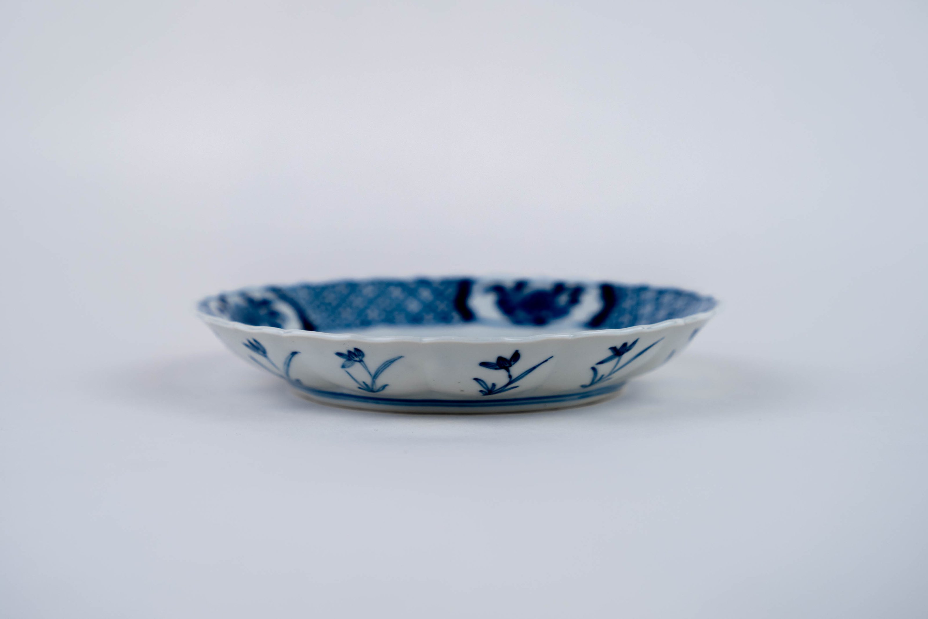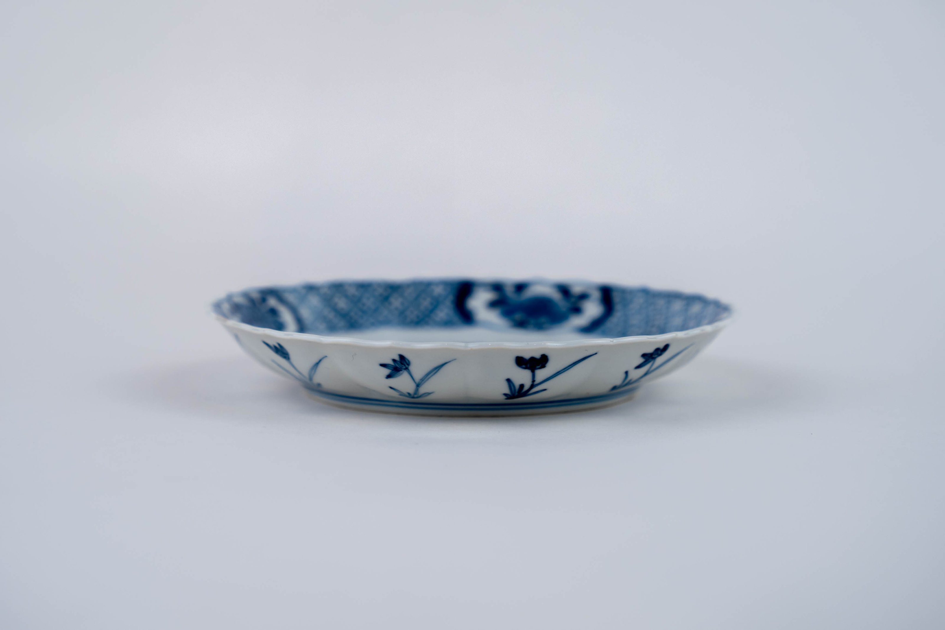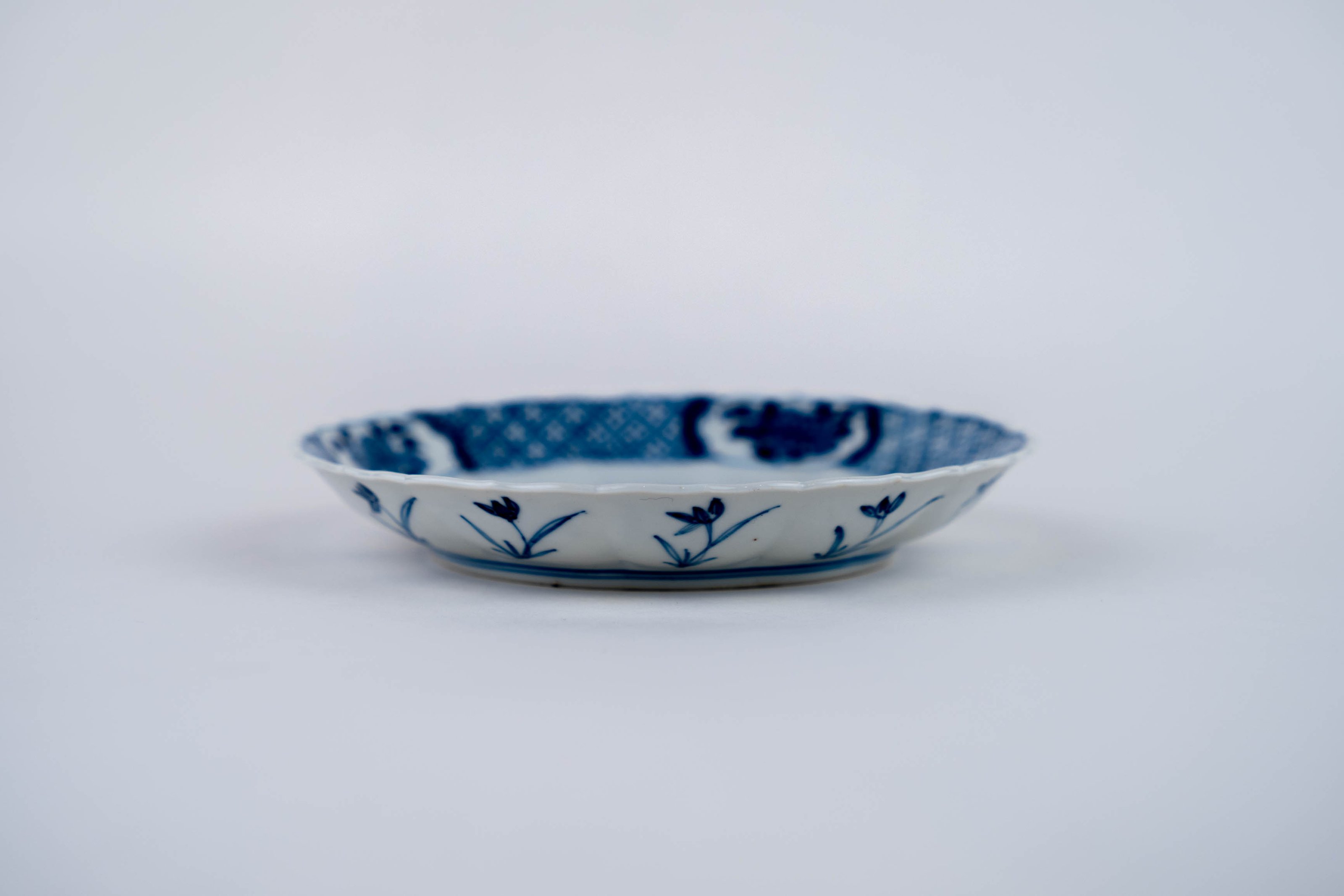 A blue and white barbed-rim plate decorated with a lady in a landscape, an apocryphal Chenghua mark to the base.