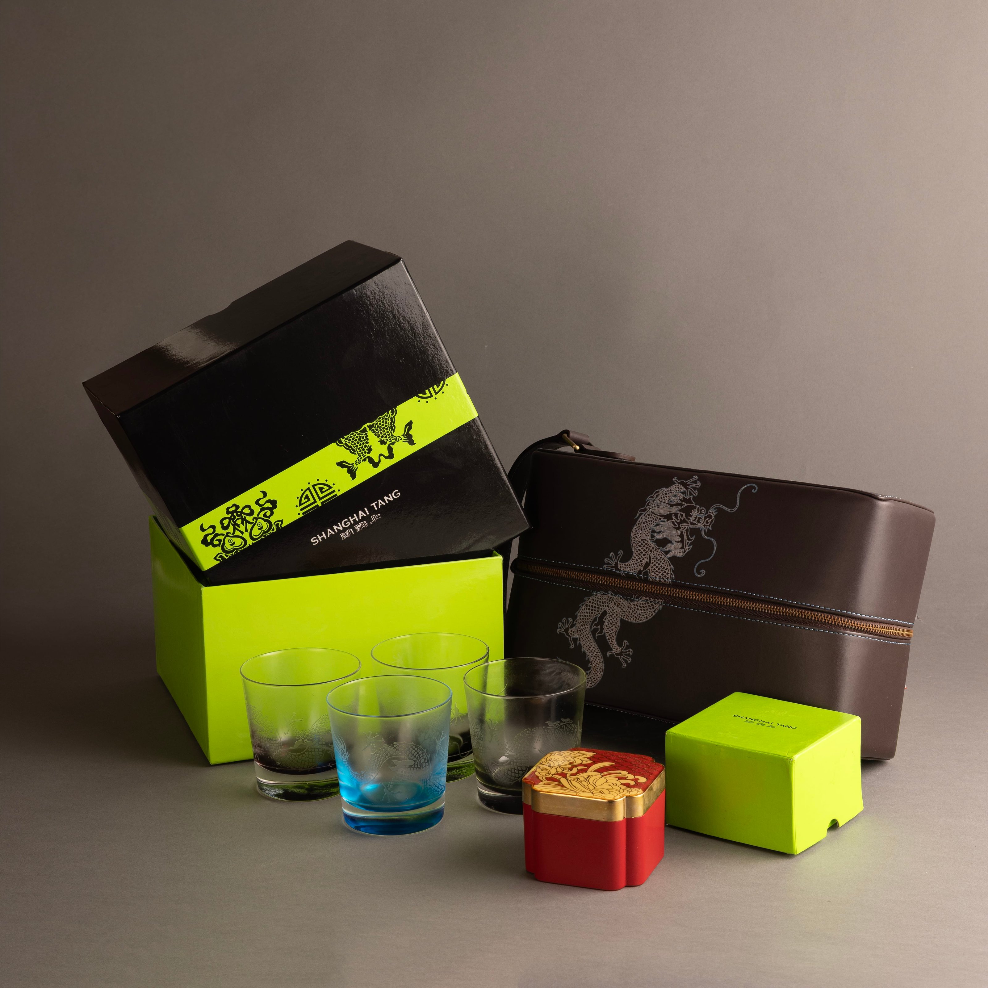 Four drinking glasses with differently coloured bases in original presentation box, each with dragon motif