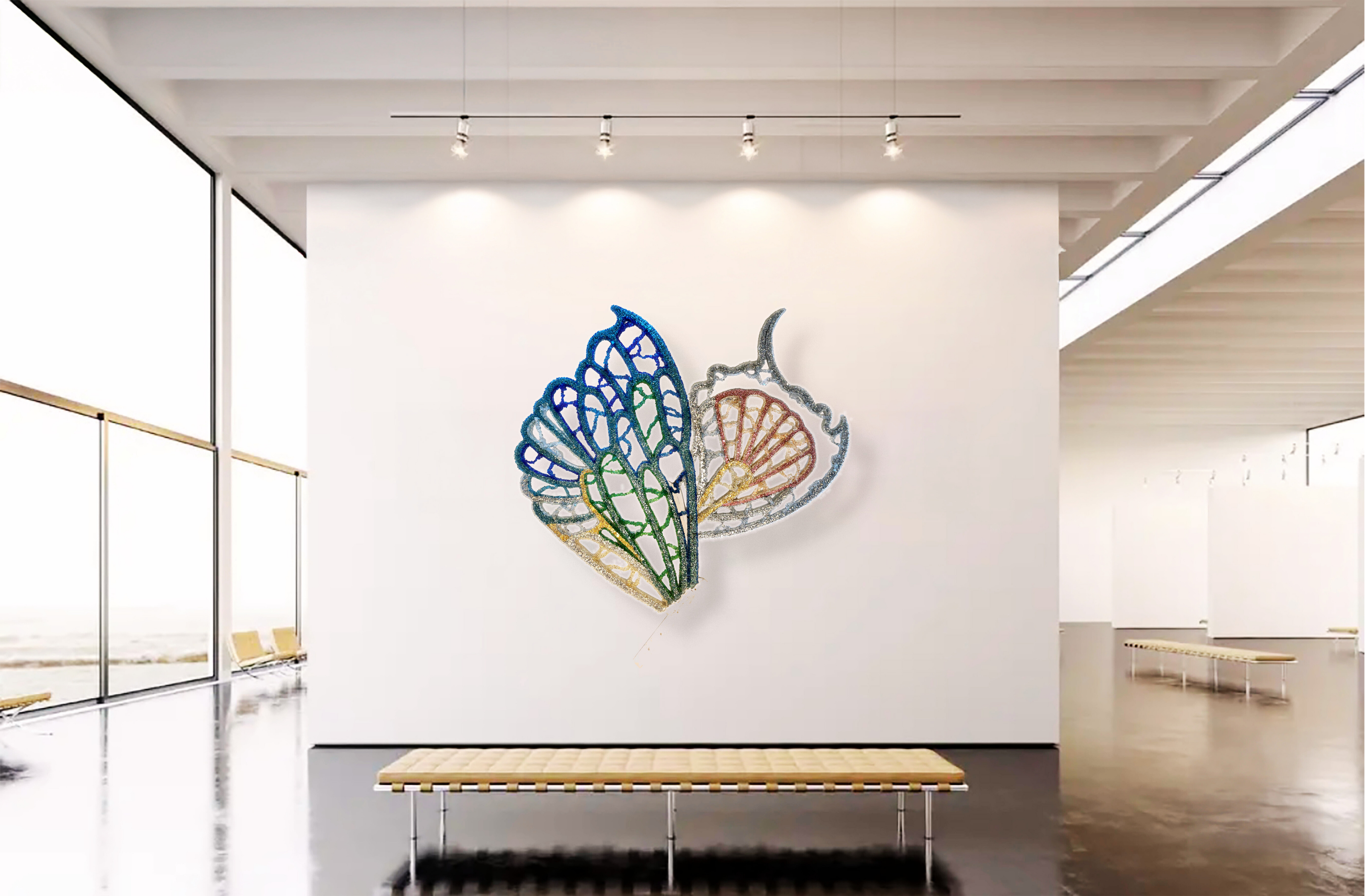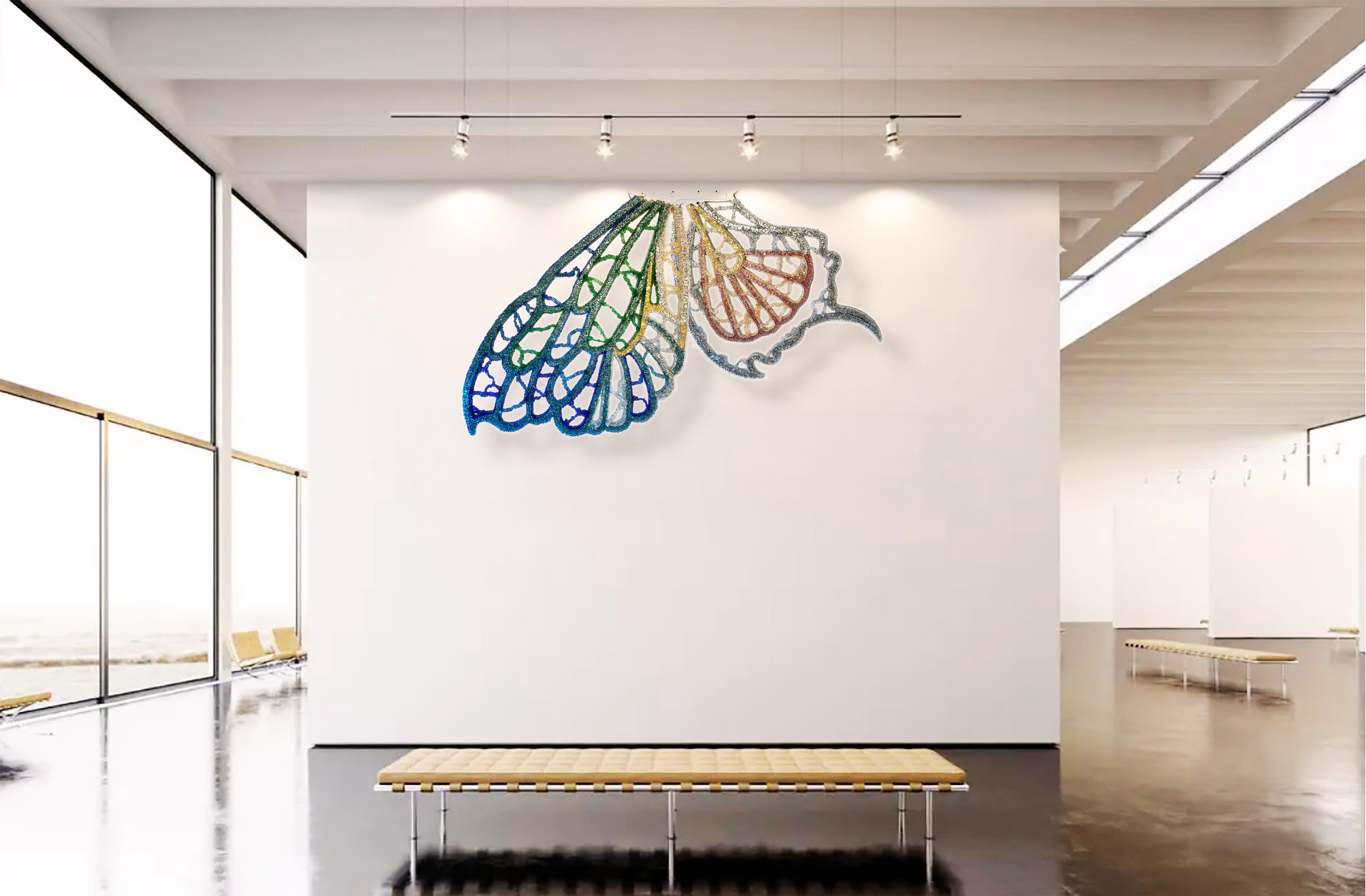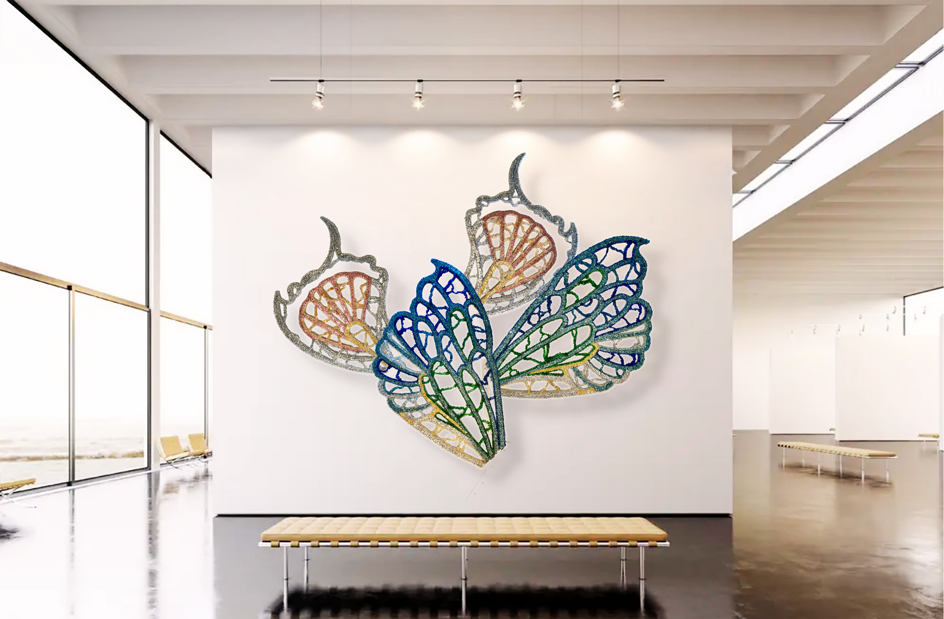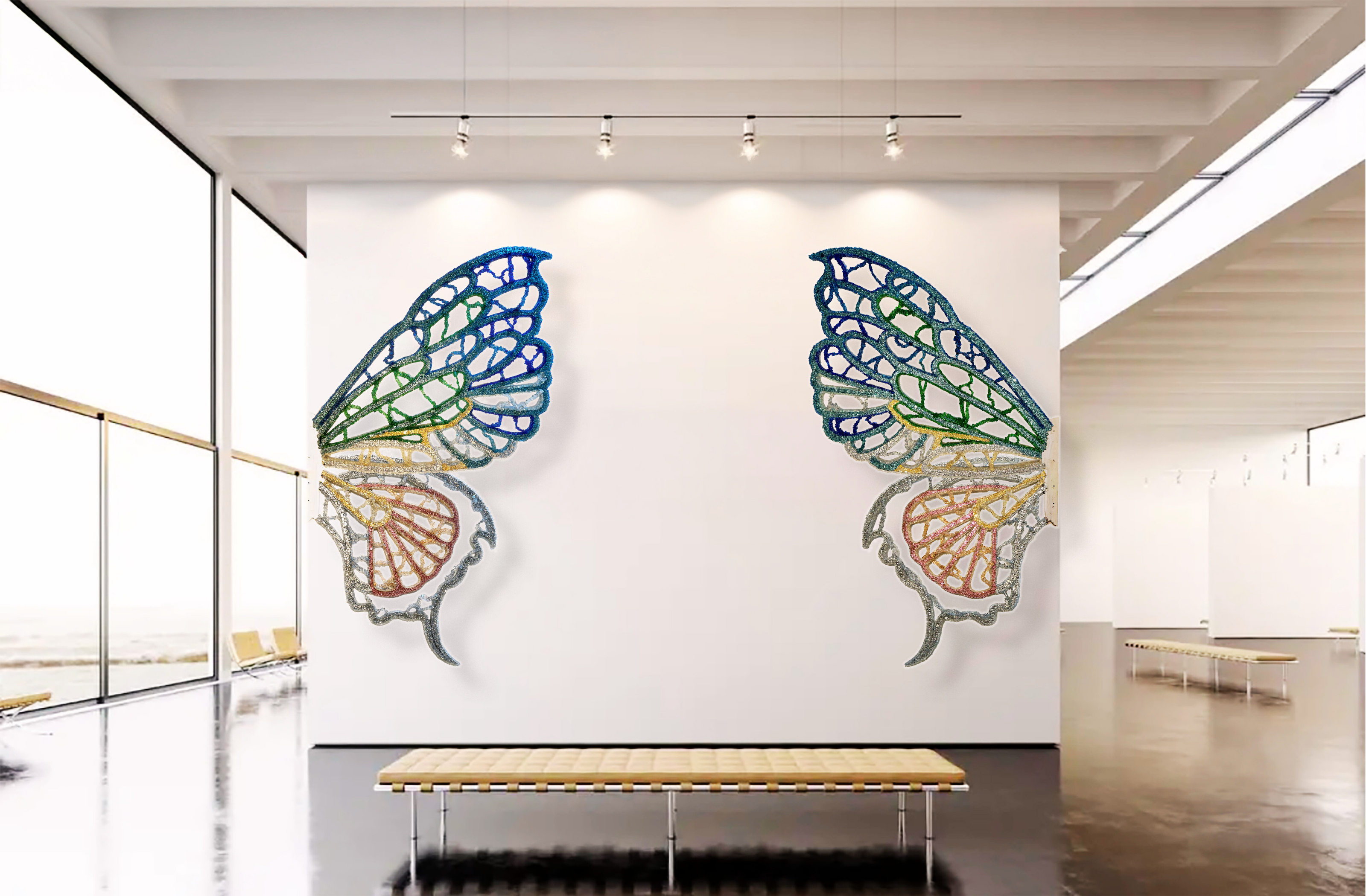 Informed by wing venation and cellular patterning, where fine vein networks support delicate translucent membranes, WINGS explores the paradox of lightness achieved through real structural load. This tension sits at the core of the work as both a material object and a sculptural form. The transfigurable nature of the work is central to its conception. Composed of four independent wings, WINGS can be separated and reconfigured into multiple sculptural arrangements. Each configuration produces a distinct spatial reading, allowing the work to continually regenerate rather than resolve into a single fixed form—drawing on ideas of metamorphosis, emergence, and transformation inherent to the insect world. The work began as an open framework for community participation, with hundreds of participants placing fine glass fragments—each measuring less than a cubic centimetre—onto large-scale steel frames, introducing organic irregularities through collective participation. Following this phase, the work was extensively reworked in the studio through structural re-engineering, material editing, and surface refinement. The result is a resolved installation guided by both collective origin and individual authorship.