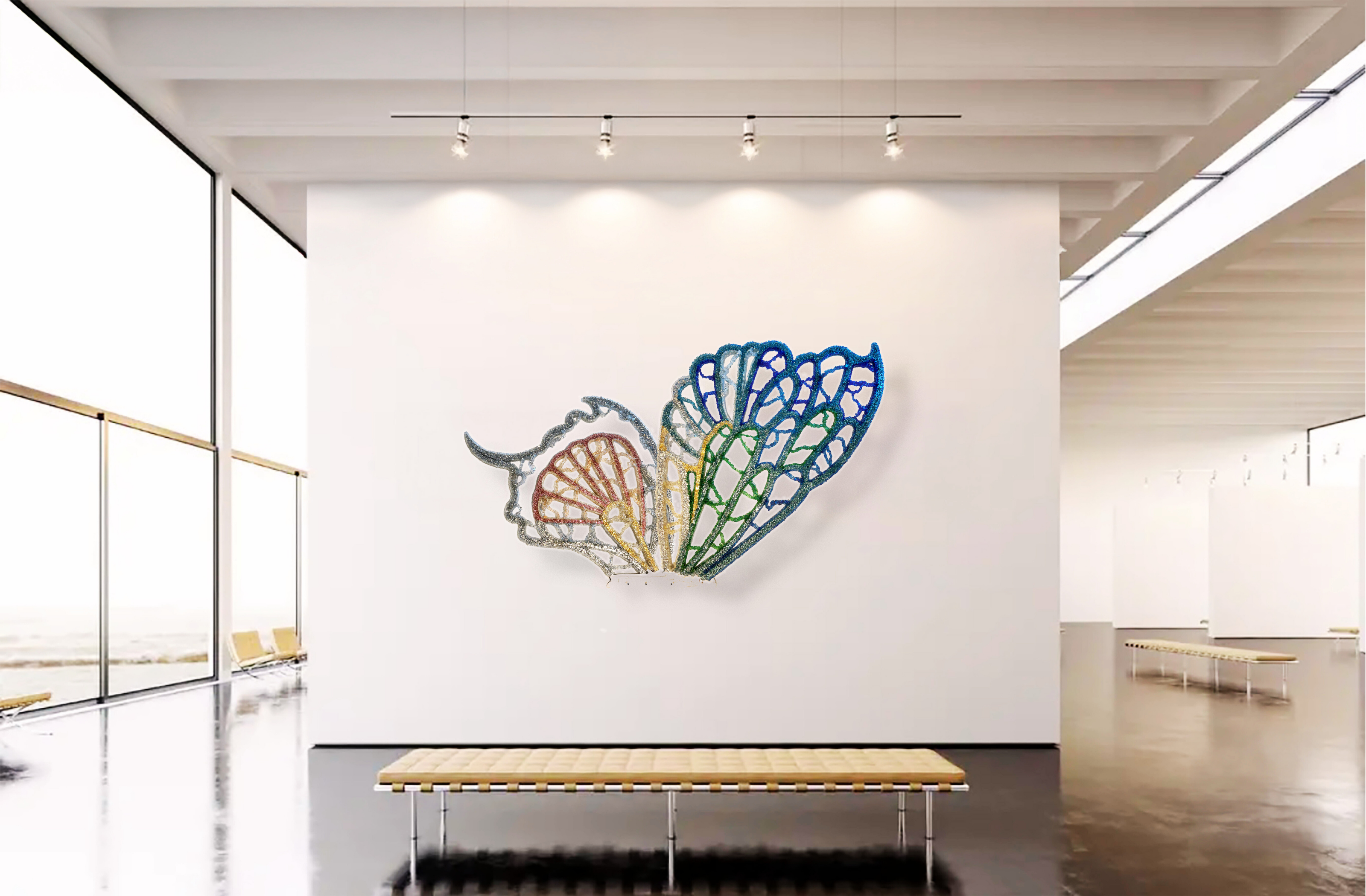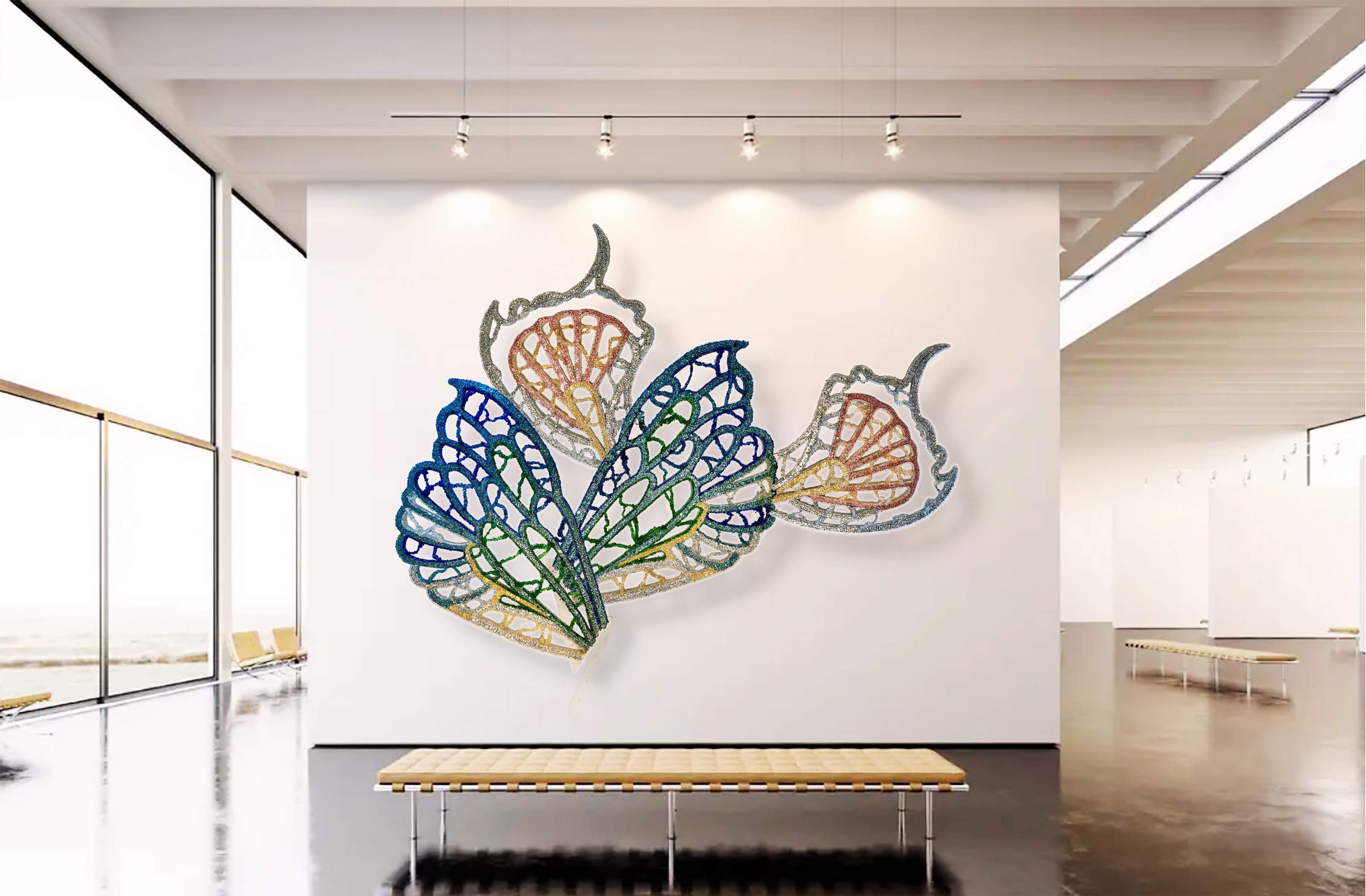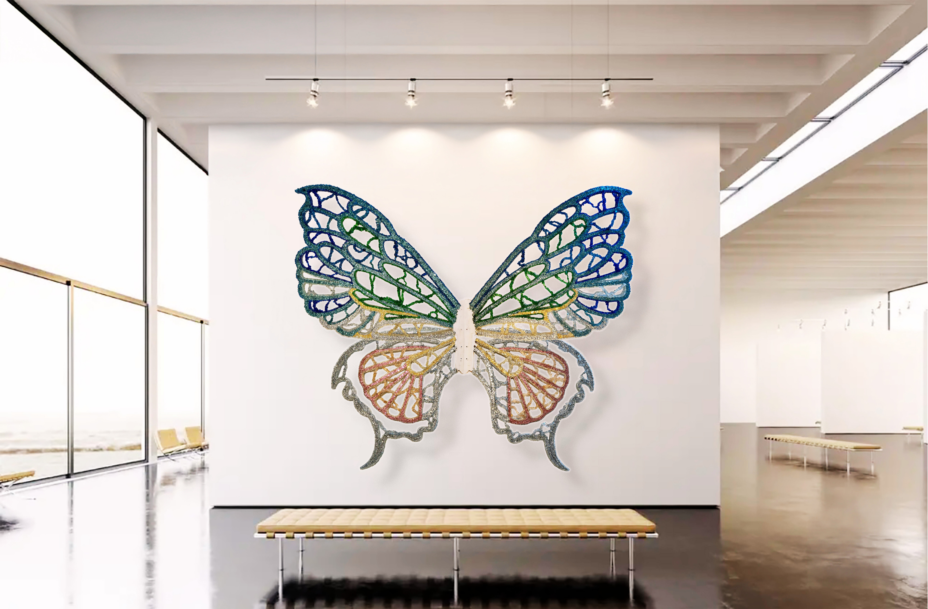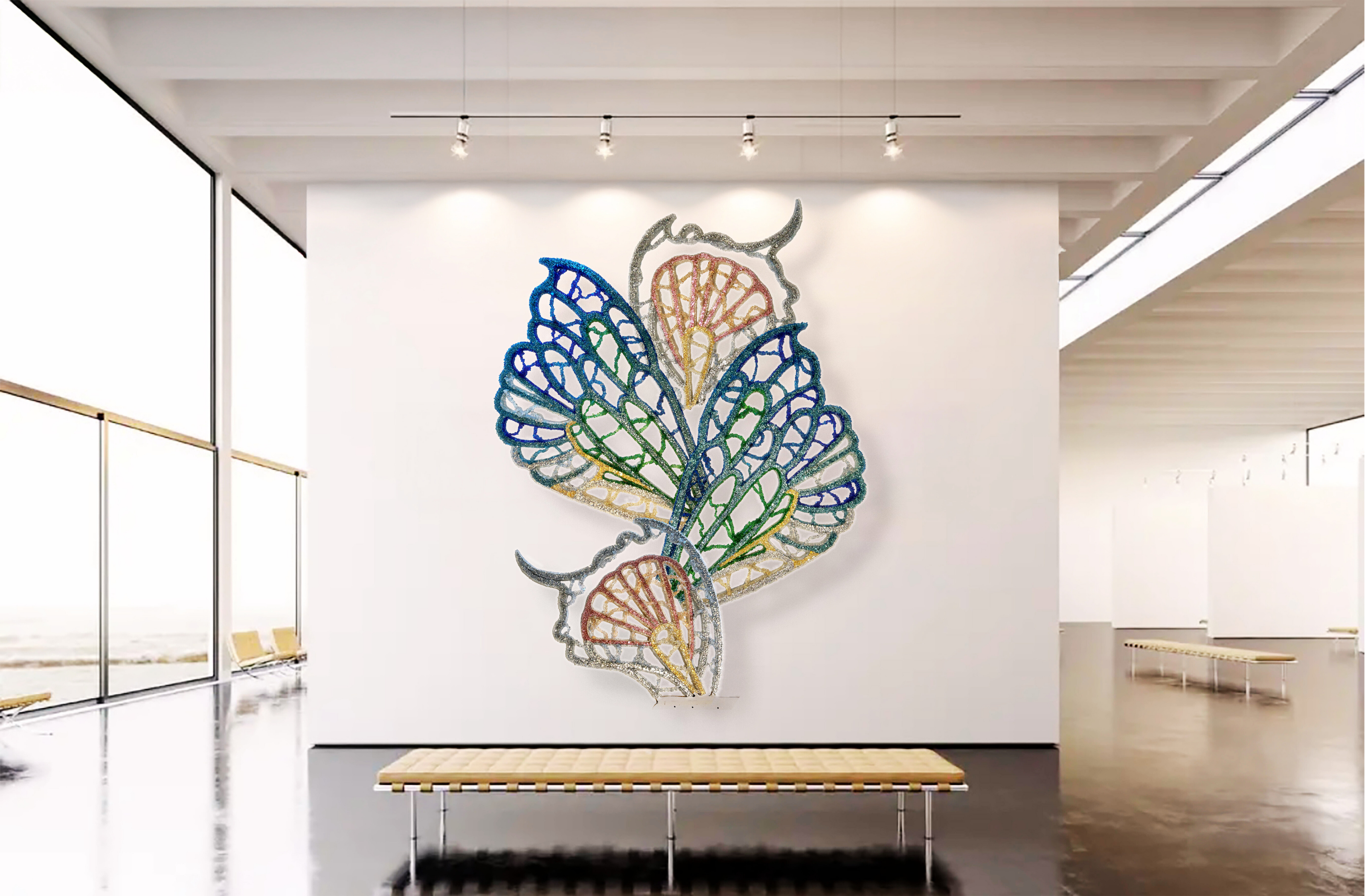 Informed by wing venation and cellular patterning, where fine vein networks support delicate translucent membranes, WINGS explores the paradox of lightness achieved through real structural load. This tension sits at the core of the work as both a material object and a sculptural form. The transfigurable nature of the work is central to its conception. Composed of four independent wings, WINGS can be separated and reconfigured into multiple sculptural arrangements. Each configuration produces a distinct spatial reading, allowing the work to continually regenerate rather than resolve into a single fixed form—drawing on ideas of metamorphosis, emergence, and transformation inherent to the insect world. The work began as an open framework for community participation, with hundreds of participants placing fine glass fragments—each measuring less than a cubic centimetre—onto large-scale steel frames, introducing organic irregularities through collective participation. Following this phase, the work was extensively reworked in the studio through structural re-engineering, material editing, and surface refinement. The result is a resolved installation guided by both collective origin and individual authorship.