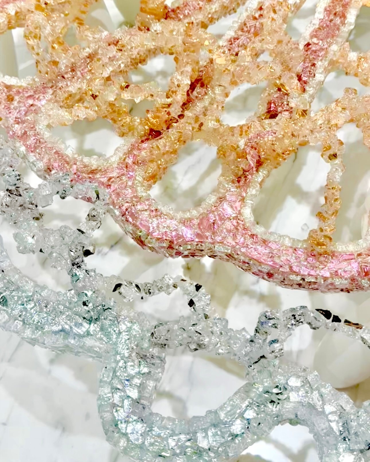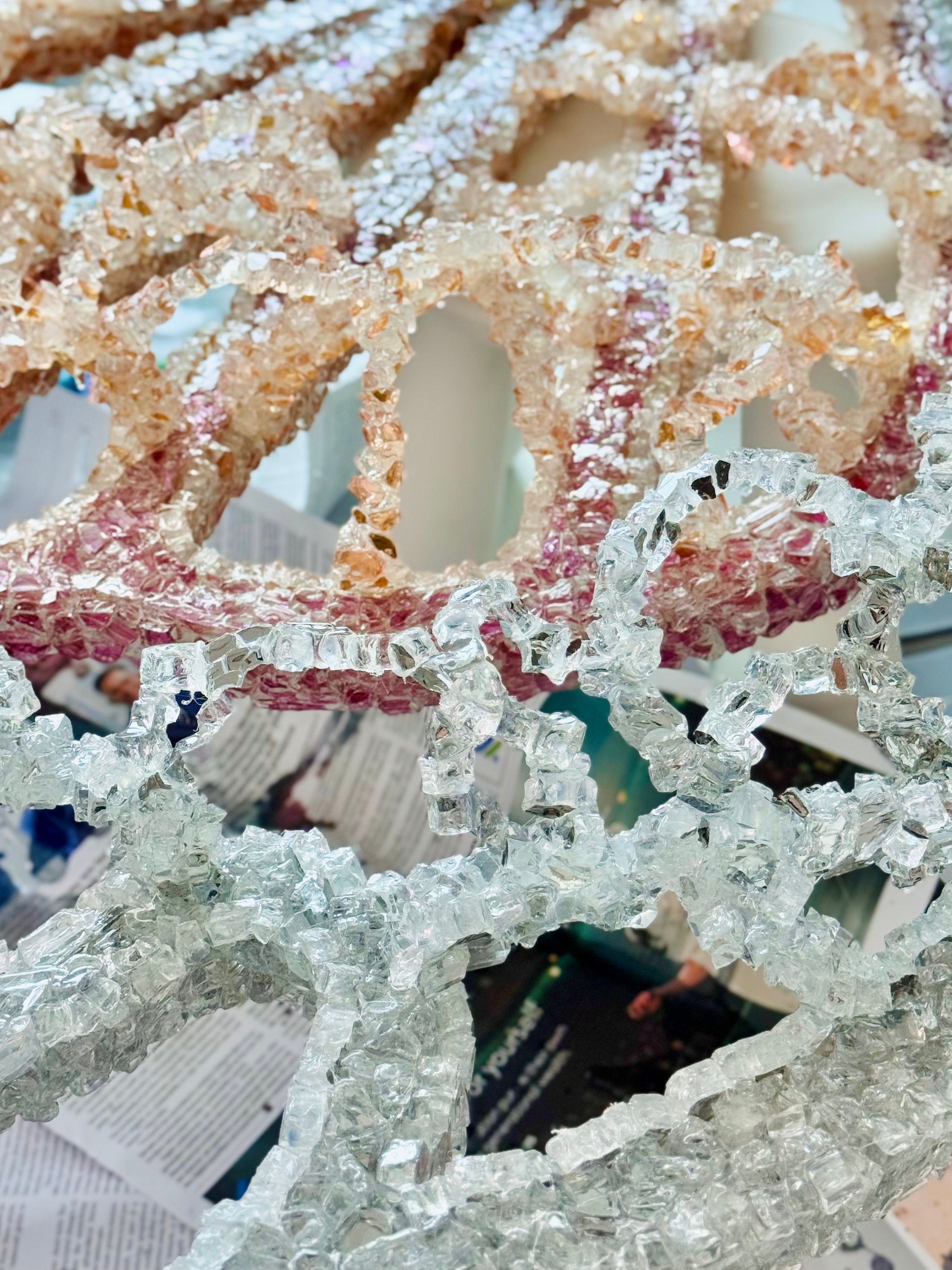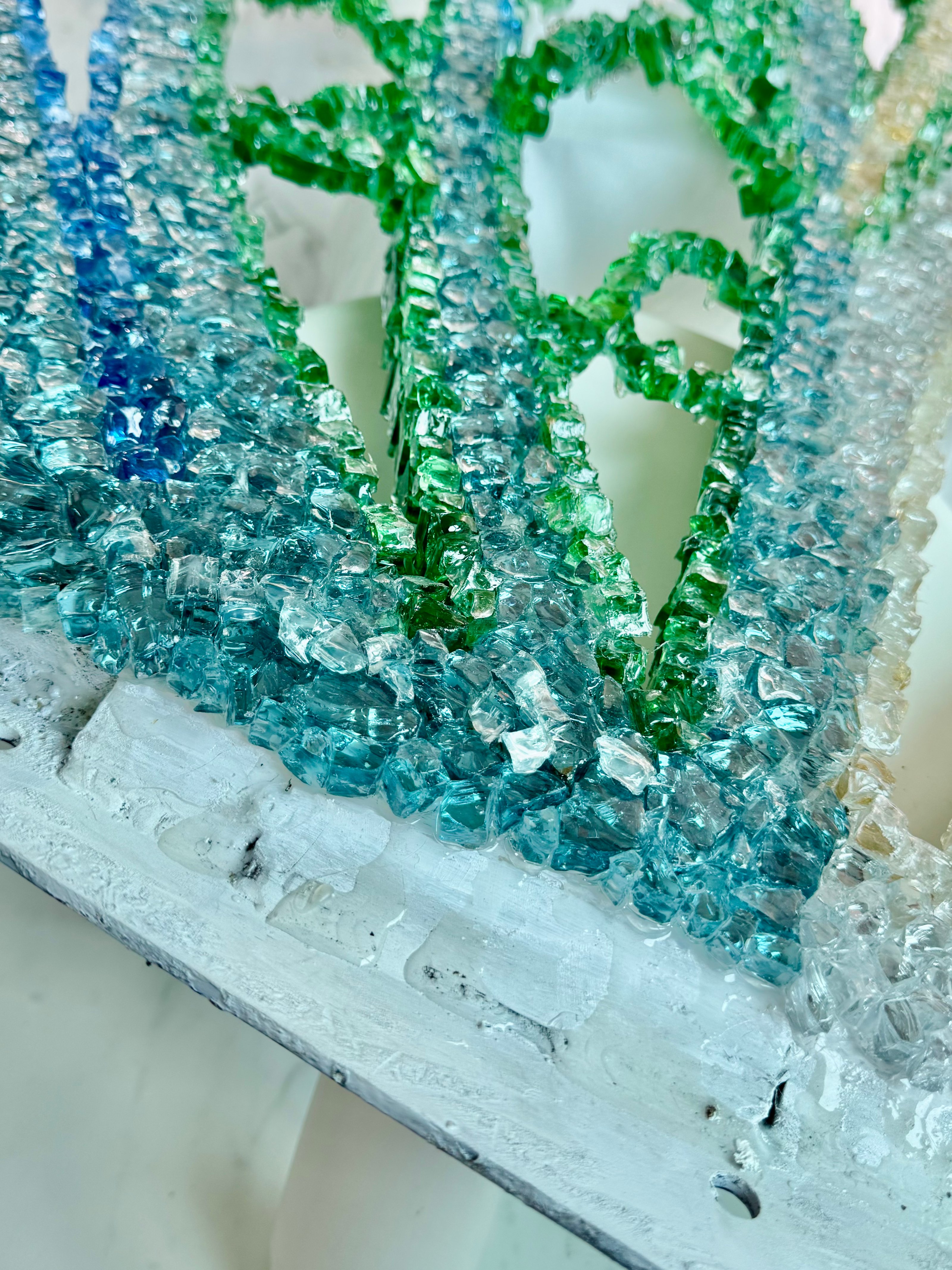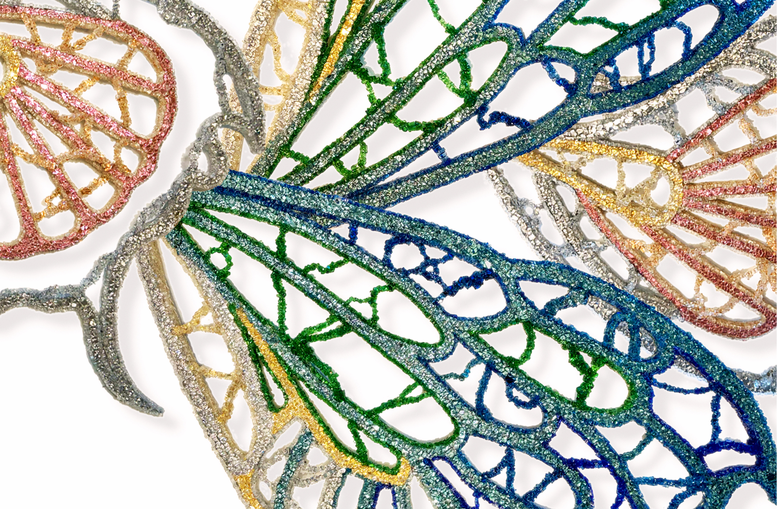 Informed by wing venation and cellular patterning, where fine vein networks support delicate translucent membranes, WINGS explores the paradox of lightness achieved through real structural load. This tension sits at the core of the work as both a material object and a sculptural form. The transfigurable nature of the work is central to its conception. Composed of four independent wings, WINGS can be separated and reconfigured into multiple sculptural arrangements. Each configuration produces a distinct spatial reading, allowing the work to continually regenerate rather than resolve into a single fixed form—drawing on ideas of metamorphosis, emergence, and transformation inherent to the insect world. The work began as an open framework for community participation, with hundreds of participants placing fine glass fragments—each measuring less than a cubic centimetre—onto large-scale steel frames, introducing organic irregularities through collective participation. Following this phase, the work was extensively reworked in the studio through structural re-engineering, material editing, and surface refinement. The result is a resolved installation guided by both collective origin and individual authorship.